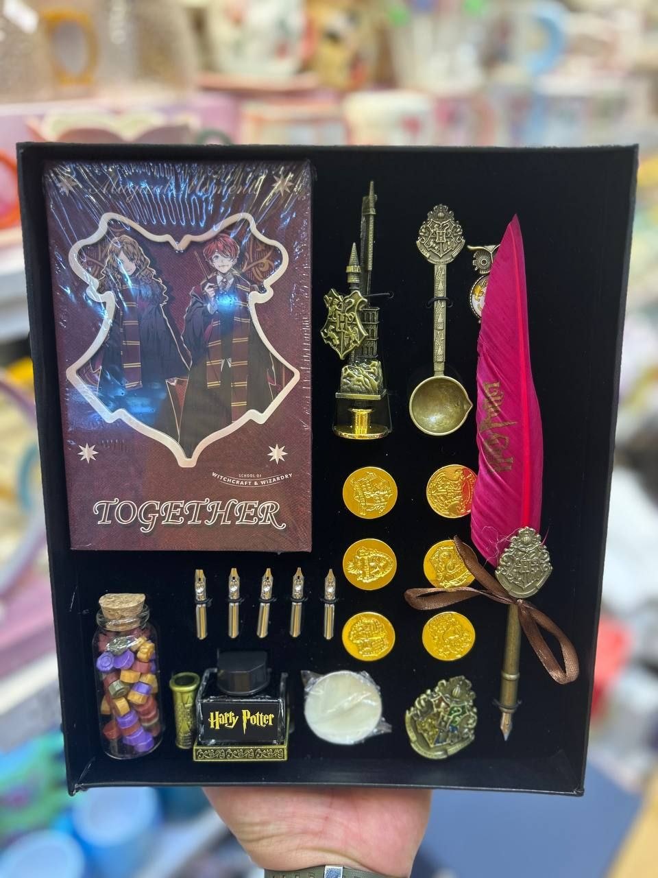 كامل نوت وأختام وشمع وقلم حبر وحبارة واستاند قلم وحامل شمع ودبوس وشعار هاري بوتر و سنون للقهم بمقاسات مختلفة